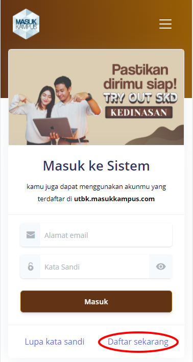 2. Pilih “daftar sekarang” untuk mendaftarkan diri kamu sebagai peserta Try Out Online SKD Kedinasan (Eksklusif)