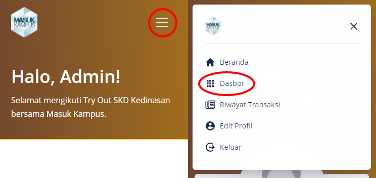 Klik menu (icon 3 garis di kanan atas), dan pilih menu “Dasbor”