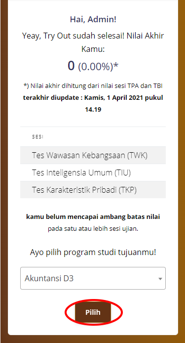 Setelah soal SKD selesai kamu kerjakan, hasil ujianmu akan langsung keluar.